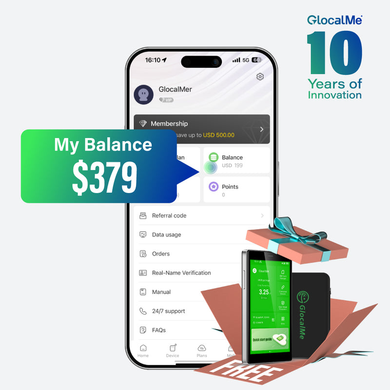 4. Existing users: Please redeem the code in GlocalMe app to top up your balance.