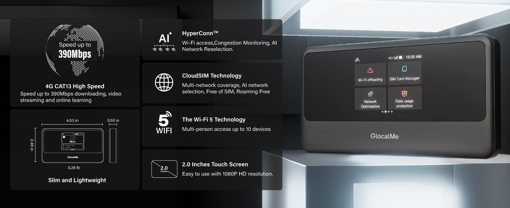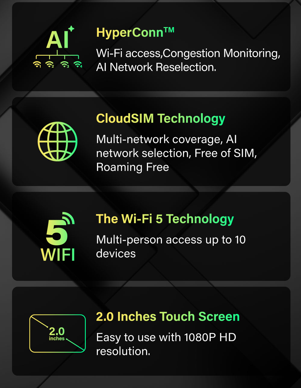 HyperConn™ technology ensures seamless connectivity through intelligent wireless evaluation, AI-driven network switching (4G/3G/Wi-Fi), and three-layer access. It monitors real-time performance and automatically switches to optimal networks for uninterrupted connections.
