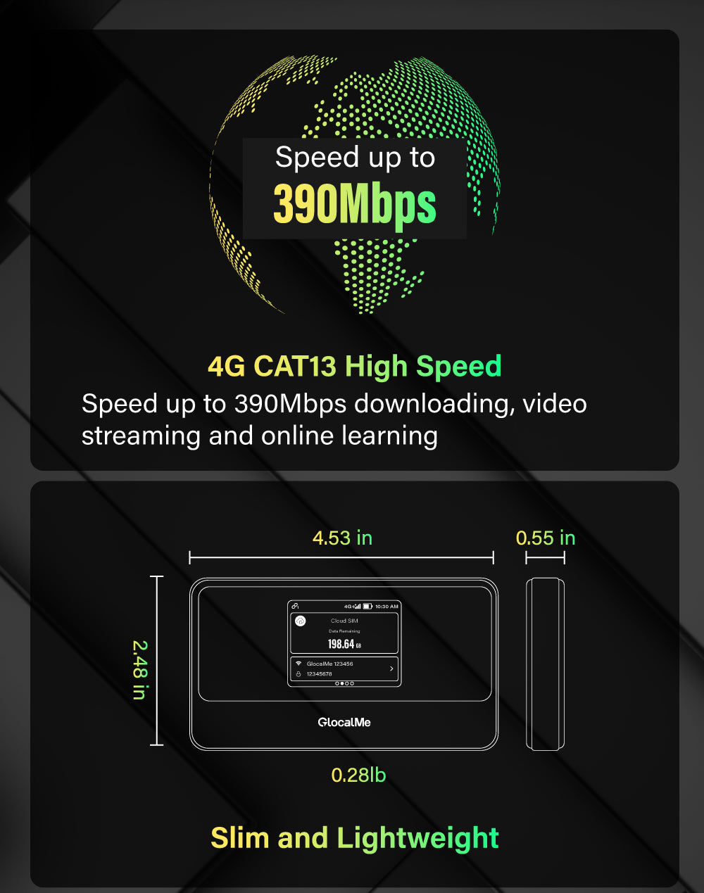 Download Speed up to 390Mbps, Nearly three times the speed of previous-generation technology. Always connect to the best 4G internet.